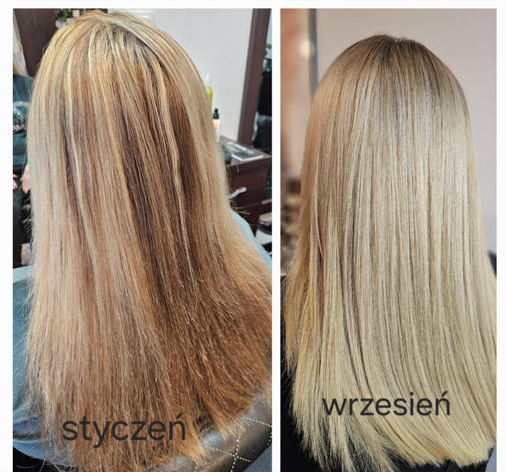 Jak widać na drugim zdjęciu, nic nie stoi na przeszkodzie, aby mieć piękny, zadbany blond. Osiągnięcie takiego efektu wymaga jednak staranności i zrozumienia procesu koloryzacji. Dzięki odpowiednim produktom i technikom, które wykorzystałam, udało się uzyskać naturalny efekt, który zachwyca zarówno klientkę, jak i mnie.